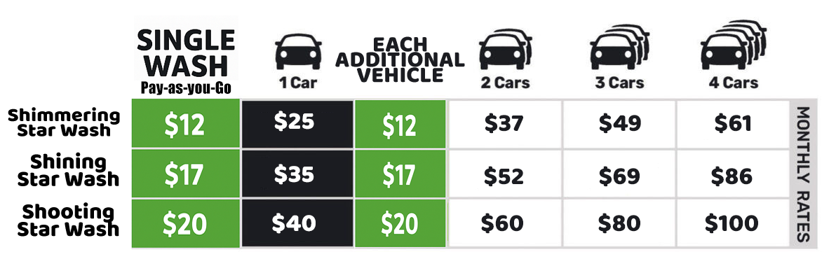 We’re honored you want all your vehicles to have that Star Brite shine!Additional vehicle pricing:Each additional vehicle is billed at the single-wash monthly rate of the wash level you’re enrolled in.Current monthly rates per additional vehicle:• Shimmering Star Wash: $12/month• Shining Star Wash: $17/month• Shooting Star Wash: $20/monthHow it works:• All vehicles must be on the same wash level• Each additional vehicle is billed separately• Each vehicle receives its own wash passClick here to add additional vehicles to your membership and get started!